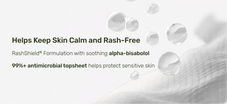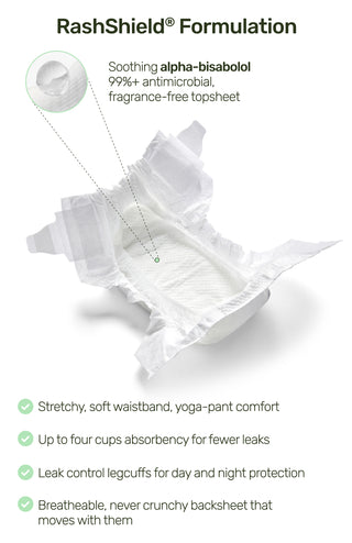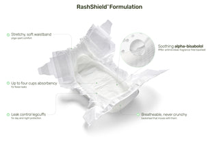 - RashShield® with Alpha-Bisabolol: Infused directly into the topsheet for 99%+ antimicrobial effectiveness to help prevent diaper rash before it starts.