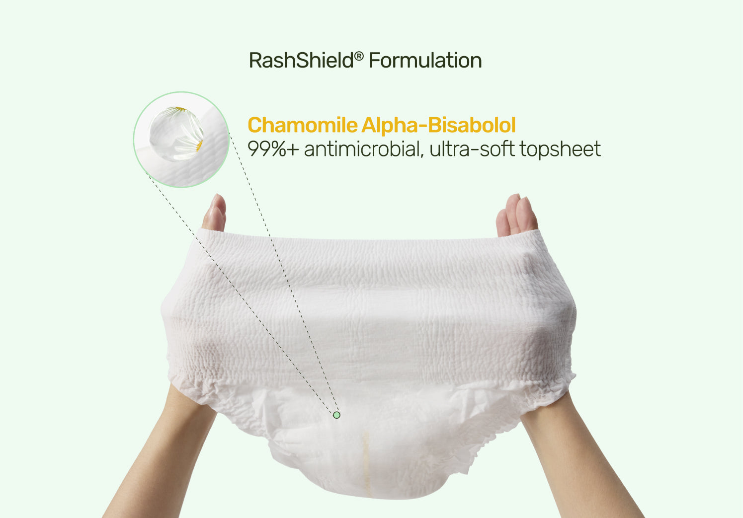 Safe and gentle by design. Parasol diapers feature a chamomile Alpha-Bisabolol topsheet, a skincare ingredient clinically recognized for calming and protecting delicate skin. Each layer is thoughtfully made with high-performing SAP, an 8-strand elastic waistband, latex-free tabs, and an ultra-soft breathable backsheet with body-conforming leg cuffs for a snug, gentle fit.