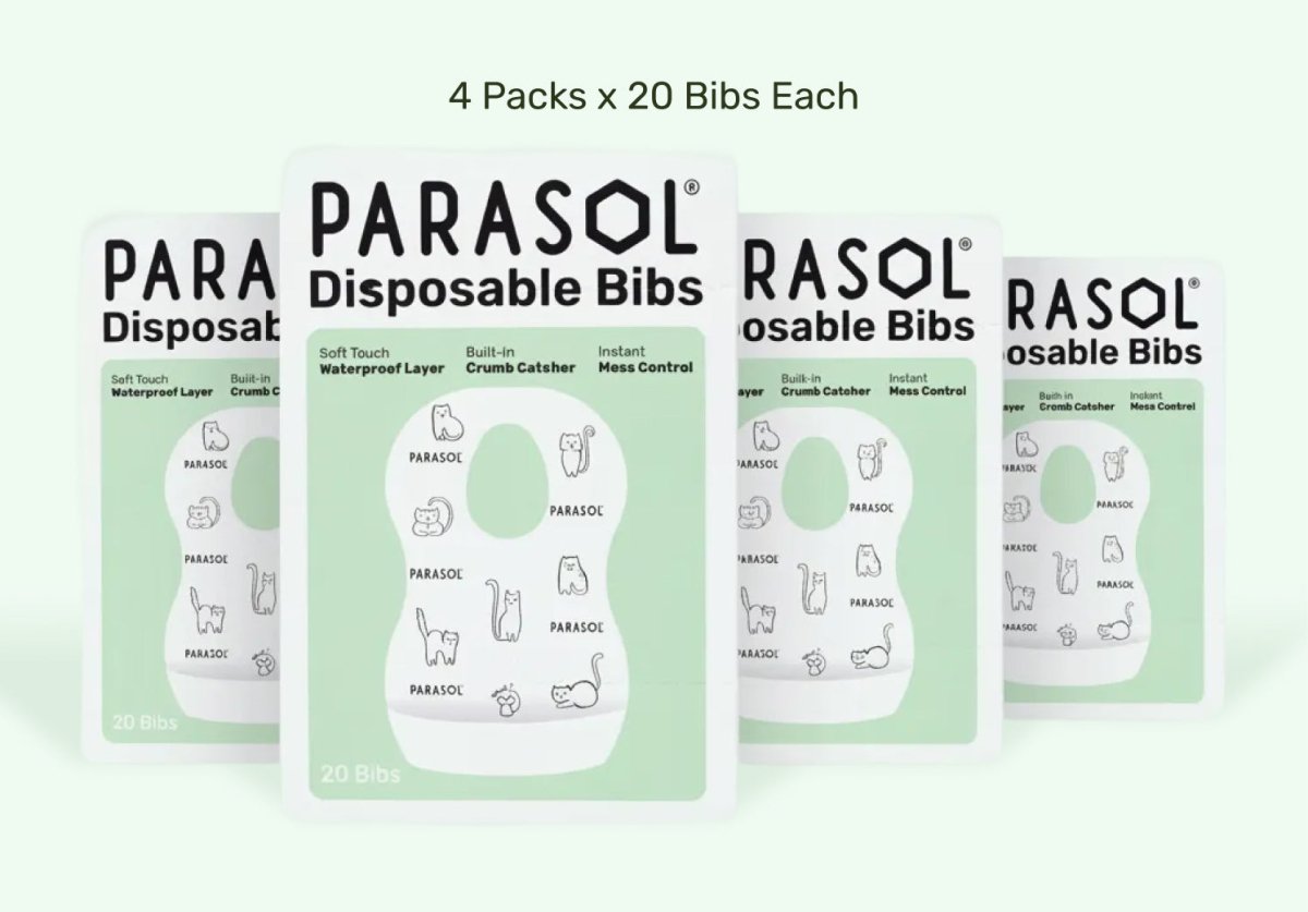 Parasol Disposable Bibs were created for real-life feeding moments. Each bib features a soft, absorbent top layer to help catch spills, a leak-resistant waterproof backing to keep clothes dry, and a fold-out crumb catcher that helps contain drips and runaway snacks.